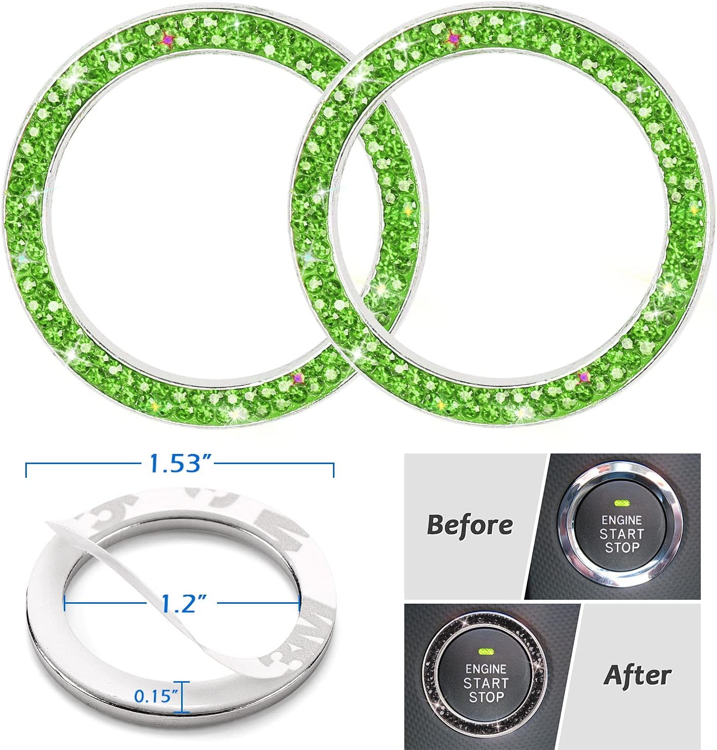 ToBeQueen green crystal car accessories help you save times and money, you don't have to work hard to find all kinds of neon green car decor,you can easily get them here at a fair price!And No chromatic aberration! here we go!Package included:* Green Mask Hook Clip4* Green Car Headrest Collar Rings1* Green Car Charger Adapter2* Green Var Hooks2* Green Push to Start Button Cover4* Green Tire Valve Stem Caps1* Green Sun Glasses HolderUniversal fit ,but these orange sparkly car accessories set NOT COMPATIBLE with Cherokee/Compass/Renegade, 2018 Tiguan SEL, 2018 Mazda 3, 2017 Cadillac XT5, BMW 325xi, Modern Tucson, Smart Forfour, 2014 Mazda CX-5, 2018 Chevy Tahoe, 2016 VW JettaFord Expeditions, Dodge Journey, Rogue, 21 Atlas Cross, Ford TaurusReminder:Bling Mask Hook Clip:·Stick it on the clean surface.After hook is glued,you need to waiting a few minutes before using itCar Headrest Collars Ring:·Notes:please ensure its the right size for your car before you orderCar usb charger:·Applicability:compatible with iOS and Android,Can charges your iPad,iPhone,Phones,etcCar Hooks Headrest Hangers:·Max Load 44lbs:Also is a Perfect mask hookBling Start Stop Button Rings:·Please DO NOT apply to car ignition if your car has ANTI THEFT AlARM or Key Fob with a Chip! If you have a key with a Chip in it - this ring can cause interference with the transponder in your key and the ignition and you may not be able to start your car.Bling Tire Valve Stem Caps:·Don't screw the knob cover too tightly in case you can't take it offBling Sun Glasses Holder:·It can clip one pair of sunglasses and an extra card.