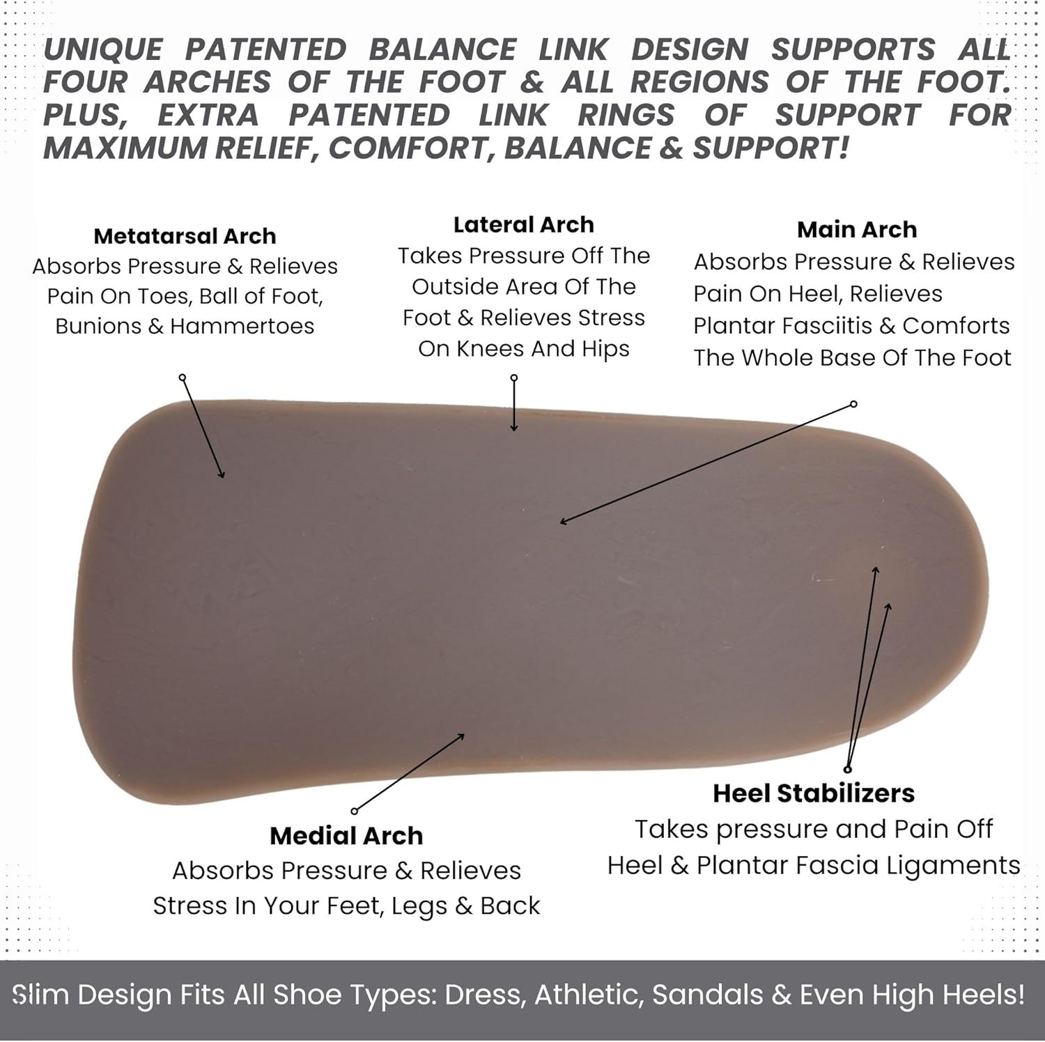 | Product Benefits | Foot Pain, Arch Support, Pain Relief, Plantar Fasciitis, Heel Pain |