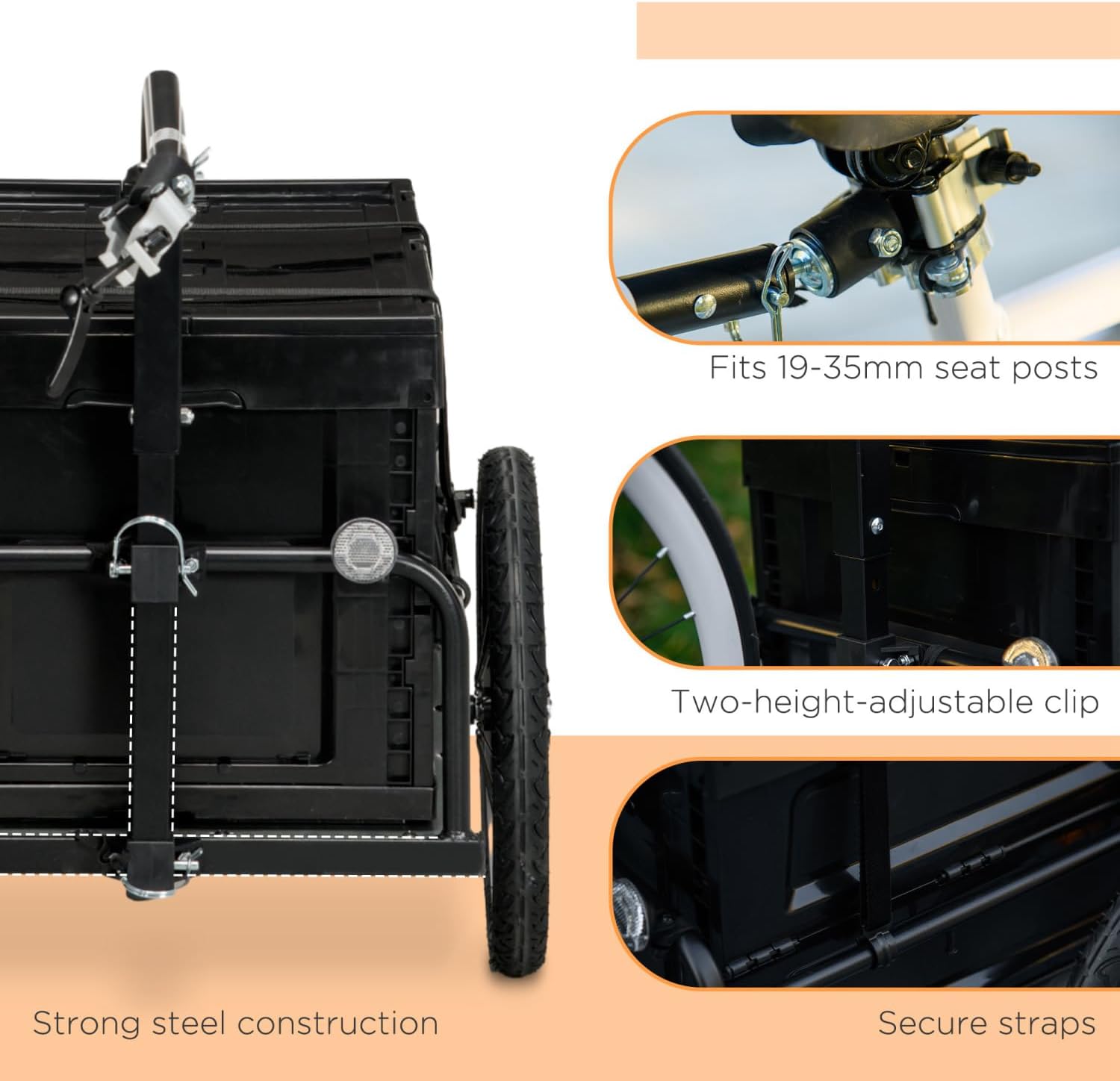 Introducing the Bike Cargo Trailer - the perfect solution for transporting your gear safely and efficiently. This versatile trailer is designed with both convenience and functionality in mind, making it ideal for bike commuting, errands, and weekend adventures. Fble Storage: The Bike Cargo Trailer features a generous 17.25-gallon removable and foldable storage box, perfect for smaller items. Need to carry something larger? No problem! The rear wall of the trailer detaches, allowing you to expand your storage space and accommodate oversized items with ease. Safety First: Ride with confidence knowing you are visible to others. Our bike trailer comes equipped with a red flag and strategically placed reflectors, ensuring enhanced visibility, especially during low-light conditions. Built to Last: Crafted with a robust metal frame, this trailer is designed to withstand the rigors of regular use. Large pneumatic tires provide excellent traction and effectively absorb vibrations, delivering a smooth and comfortable ride. Effortless Convenience: Attaching and detaching is a breeze with our simple and quick-attach system that fits most standard seat posts (19-35mm). Plus, the quick-release wheels allow for easy disassembly for compact storage when not in use.