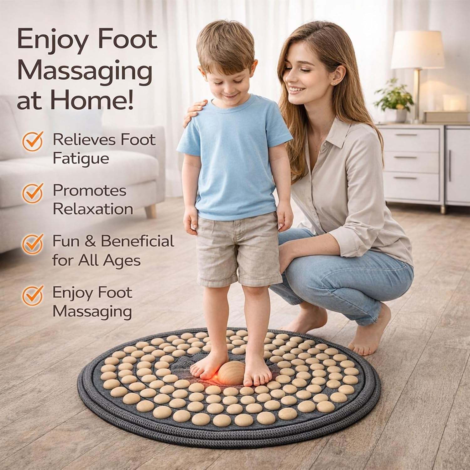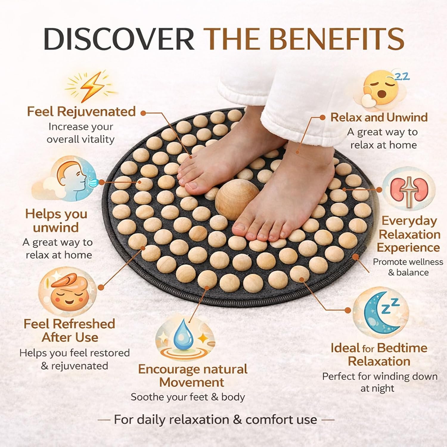 This hardwood foot massage mat is designed to fit naturally into everyday life—whether you work at a standing desk, spend long hours sitting at a computer, or stay on your feet throughout the day. The surface features a multi-point wooden bead design with a raised center area, offering balanced, full-foot contact that feels natural under bare feet. The layout helps distribute pressure evenly across the foot, creating a comfortable stimulation experience suitable for gentle, everyday use. Compared to hard plastic or stone mats, this design focuses on comfort and approachability. Smooth wooden beads paired with a soft fabric base help reduce sharp impact while still delivering clear foot feedback. It’s easy to use while standing at a desk, seated during work or Zoom calls, or stepping lightly during TV time in the living room. Its foldable and lightweight structure makes it easy to move around the home—place it under a recliner so you can step on it when getting up, keep it in the kitchen while cooking, or store it neatly when not in use. The non-slip backing enhances stability during low-intensity sessions on most floor surfaces. Built for short, repeatable moments throughout the day, this foot massage mat supports a simple, practical approach to daily foot relaxation—no electricity, no setup, just an easy habit that fits into your routine.