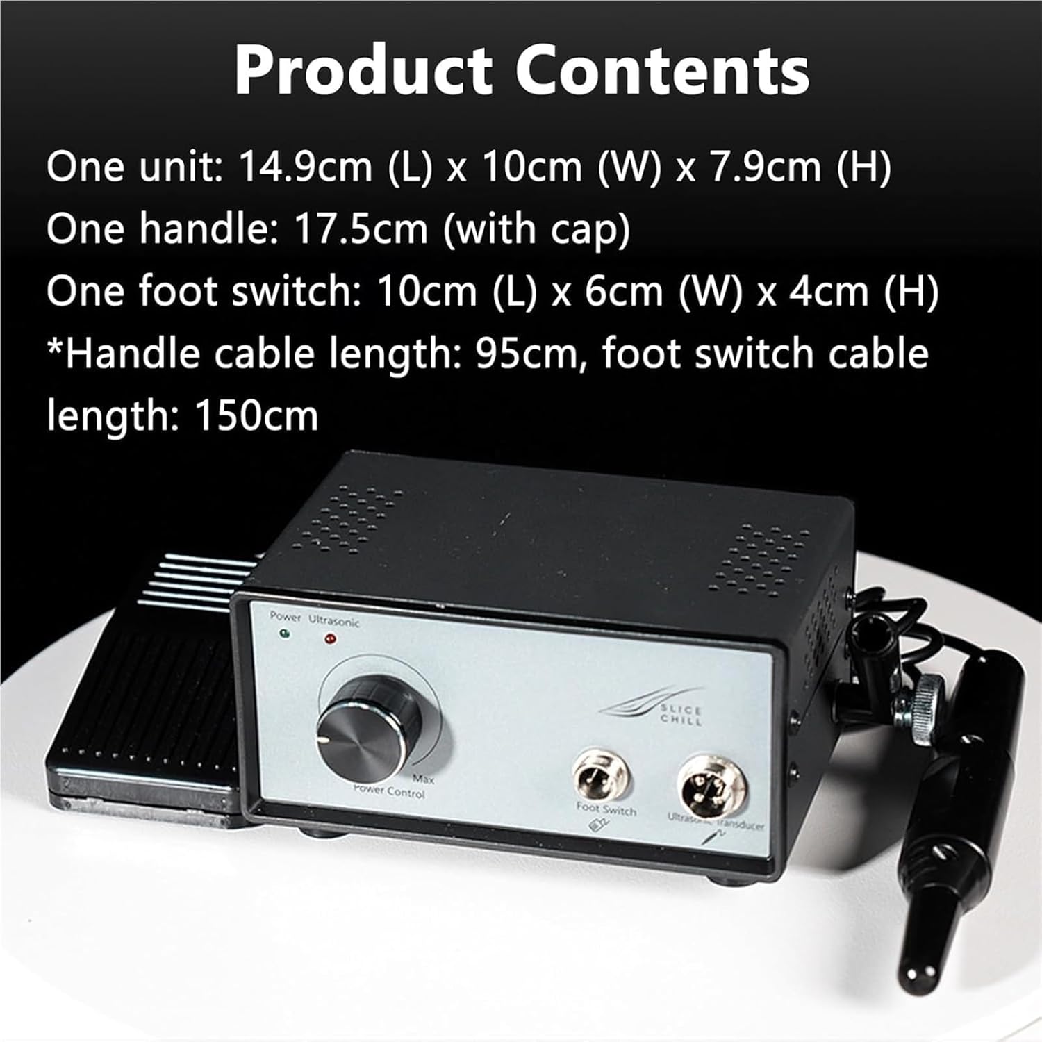 Product Specifications:Name: Handheld Ultrasonic Knife CutterPower: 40WBlade Length: 6.8inFoot Switch: 3.9in (L) x2.3in (W) x 1.5in (H)Package Includes:Ultrasonic Knife Cutter*1Handle Cable Length: 37.4in, Foot Switch Cable Length: 59.0inNote:1.Please allow 1-2cm errors due to manual measurement, note that you donot mind before order.2.Due to the differences between different monitors, the picture may not reflect the actual color.