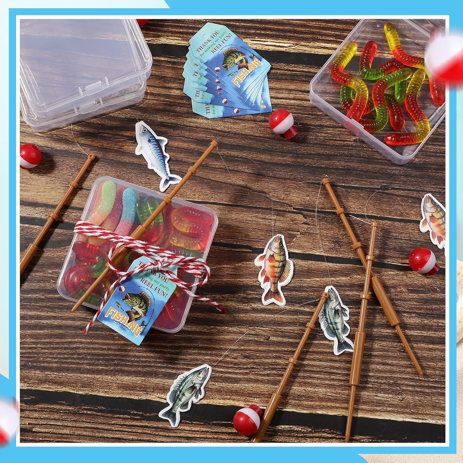Features: This fishing party gift pack is sufficient in quantity and bright in color. It is an ideal choice for your fishing theme party or as a gift for your fishing enthusiast friends. Specifications: Material: fishing tackle boxes: plastic, fishing rods: plastic Thank you card: paper, mini fish rod: paper Floats: plastic Color: multicolor Size: fishing tackle box: 3.74 x 3.74 x 1.1 inches, fishing rod: 6.3 inches long Thank you card: 2.36 x 1.38 inches, hemp rope: 22 yard Package includes: 12 x Fishing tackle boxes, 12 x mini fishing rods 12 x Red white floats, 12 x thank you cards 1 x Hemp rope Notes: This product is suitable for people over 14 years old. Manual measurement, please allow slight errors on size. The color may exist a slight difference due to different screen displays