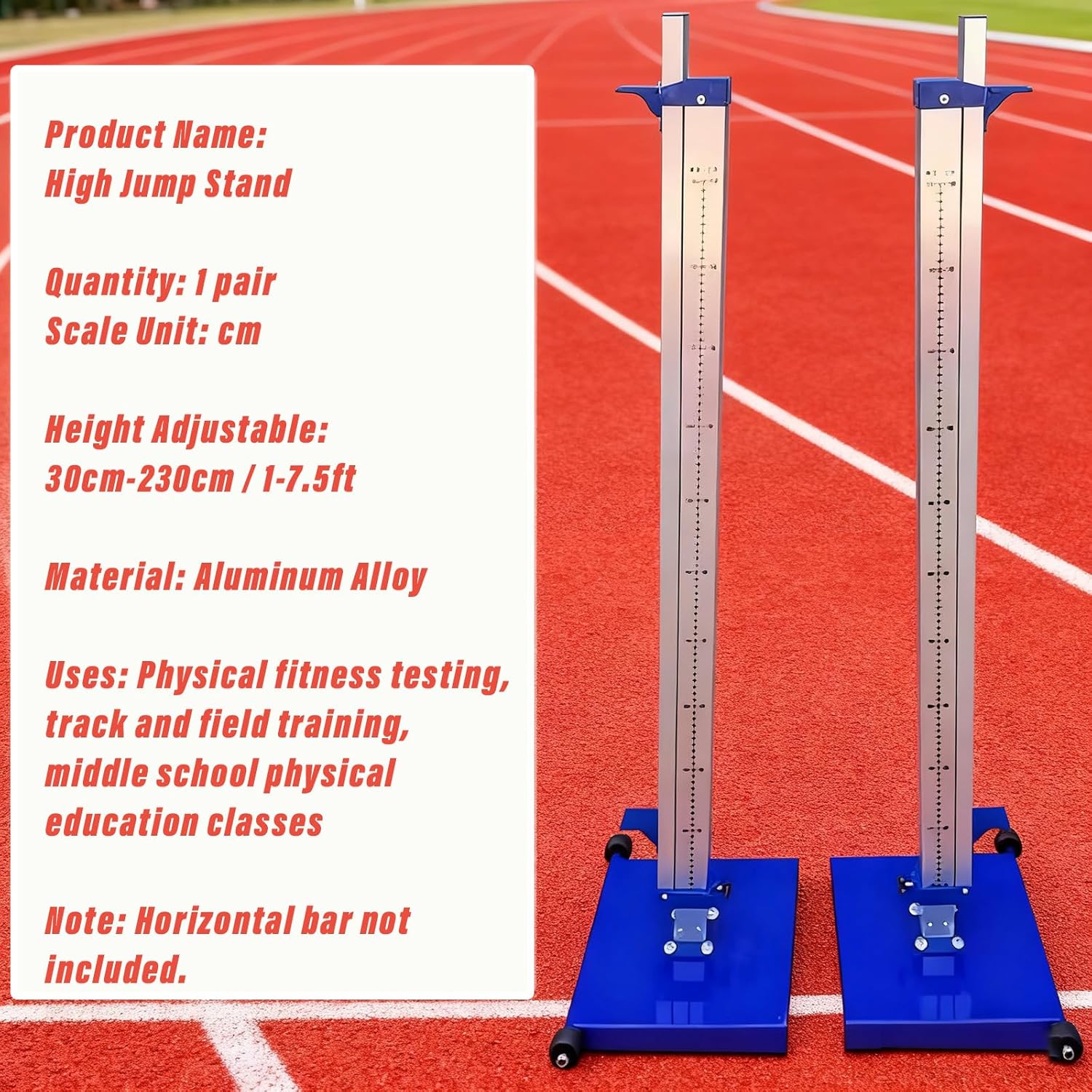 Product SpecificationsScale: Metric (cm)Upright Material: Aluminum AlloyBase Material: IronBase Dimensions: 33 x 31 cm (12.9 x 12.2 inches)Height Adjustable: 30-230 cm / 1-7.5 ftProduct FeaturesSuitable for Different Levels:This high jump training stand is designed for student training, school team competitions, and professional events.It fully meets all high jump training needs from beginner to advanced levels.Rugged and Durable:Made of durable aluminum alloy and iron, it can withstand various weather conditions and is long-lasting.Precise Adjustment:Height is easily adjustable between 30-230 cm / 1-7.5 ft.The scale is metric (cm) to meet various training needs.Easy to Move:Simple product structure, easy to install.The base is equipped with 2 smooth wheels for quick and easy movement and redeployment around the training area.Notes: Manual measurement may have an error of 1-2 cm. Please refer to the actual product.Due to factors such as monitor display and lighting, the actual color may differ slightly from the picture.Package List:1 x One pair of uprights (crossbar not included)