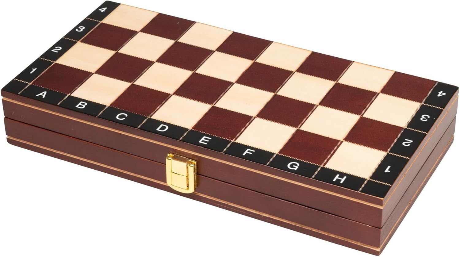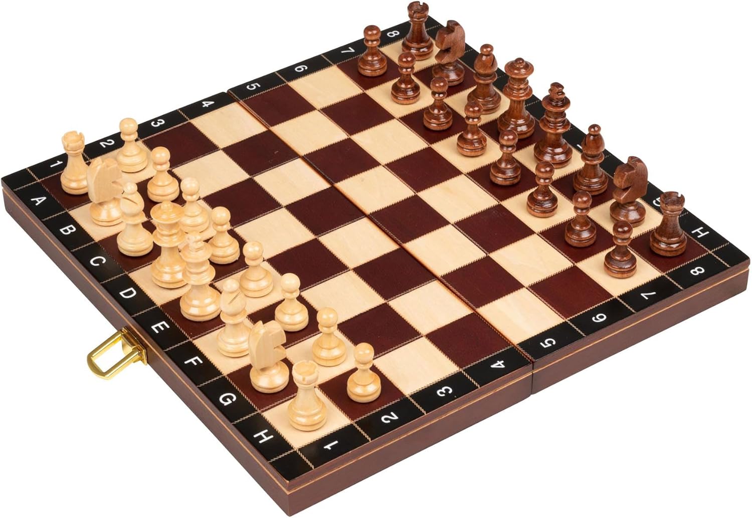 Product Description chessmen: design Staunton, schima-wood, natural and nut stained, weighted, felt base, king 48 mm. cassette: limewood, natural and nut stained, matt-finished, with numbers and letters, size 265 x 135 x 40 mm, field size 30 mm number of players: 2 recommended age: from age 6 playing time: ca. 10 minutes playing instruction: language DE, GB, FR, ES Set Contains: 1 x Travel Chess, Field 30 Mm