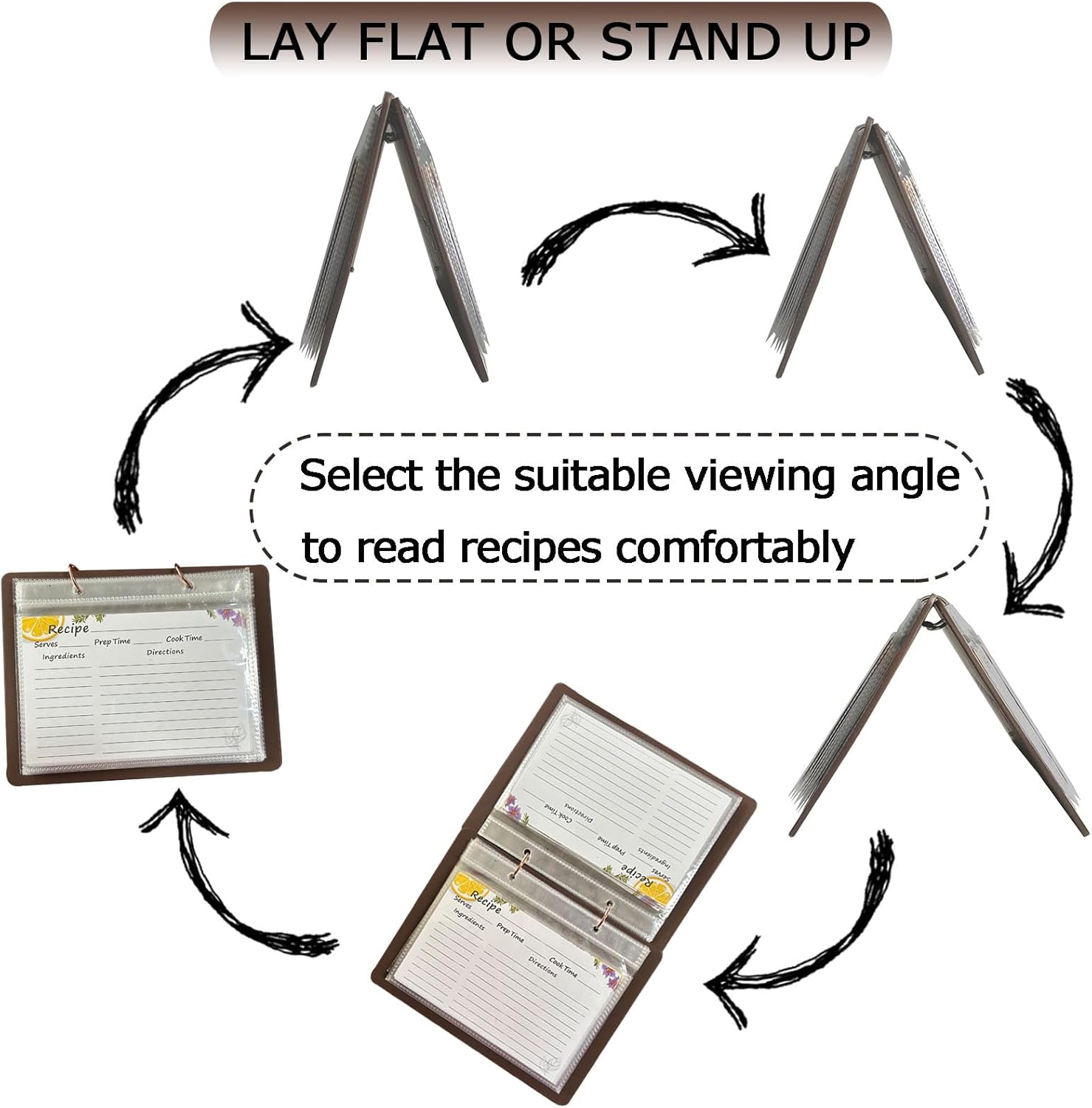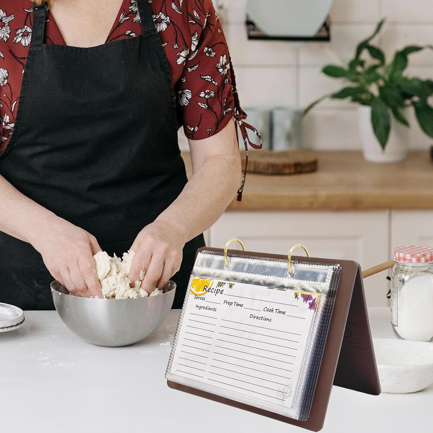 Get ready for the cooking adventure with is sleek recipe journal. Complete with blank recipe cards, just waiting for your handwritten culinary masterpieces. Simply insert them into the durable and clear card binder sleeves. They're protected for long-term use. Our uniquely designed recipe card binder lets you adjust the angle of your recipes, making it easy to read while you whip up your favorite dishes. No more awkward constant twisting – just pure cooking joy! Ditch the bulkiness and keep your recipes in their rightful place!