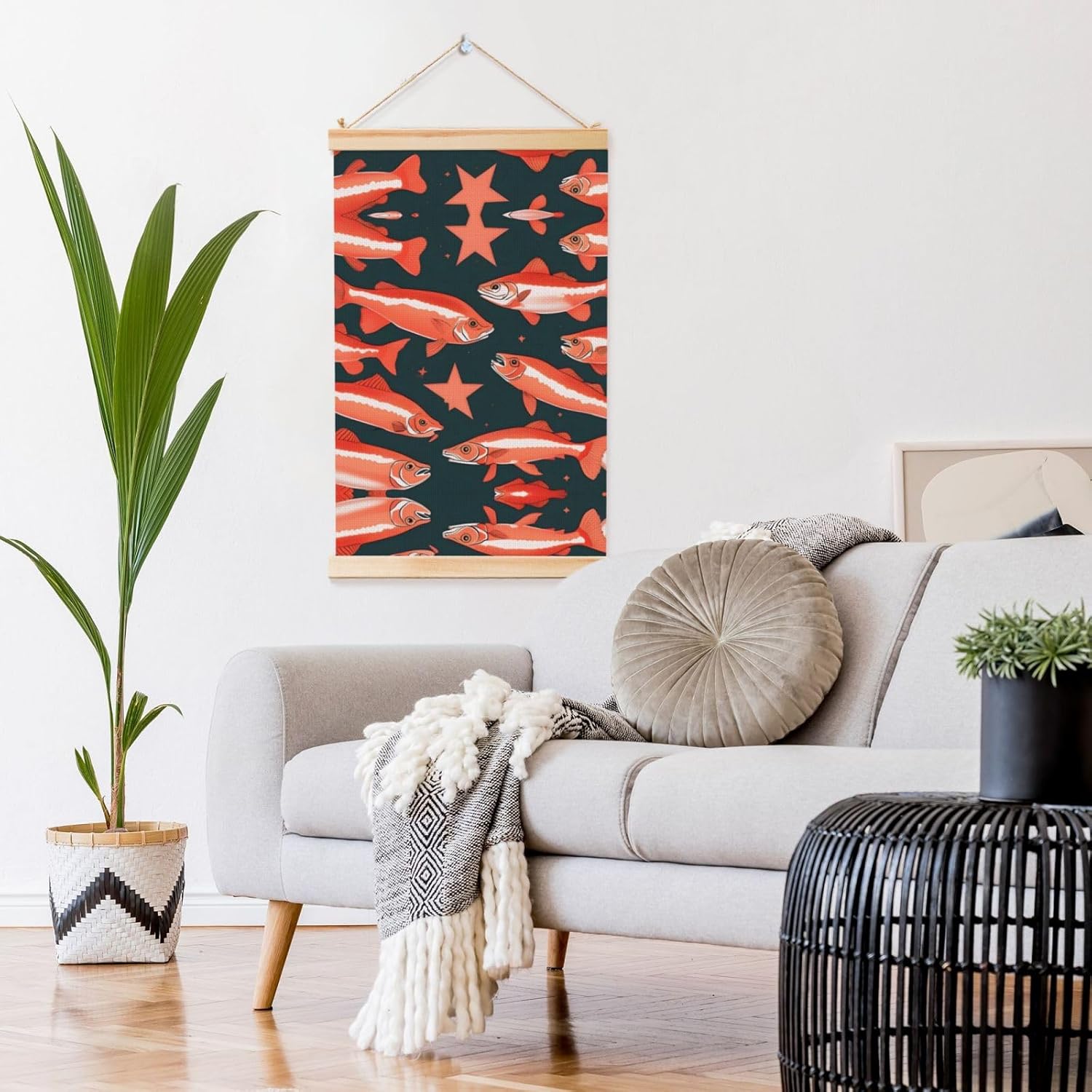 Our Salmon Print Wooden Poster Hanger Is An Excellent Addition To Your Home Decor Or A Perfect Gift For Friends And Family. Made Of Selected Quality Canvas With Brilliant And Enduring Colors, This Wall Art Is Designed To Resist Water, Dust, And Fading, Ensuring The Bright And Vibrant Art Lasts. The Polyester Is Enclosed Between Two Teak Wood Hanger Scrolls With An Attached 35cm Rope For Easy Hanging. Installation Is Made Simple With The Included Two Nails In A Plastic Box. The Modern Minimalist Style Of Our Wall Hanging Complements Any Home Decor, Elevating The Artistic Ambiance And Brightening Up The Room. Experience The Elegant Transformation This Wall Hanging Scroll Painting Brings To Your Spaces Today.