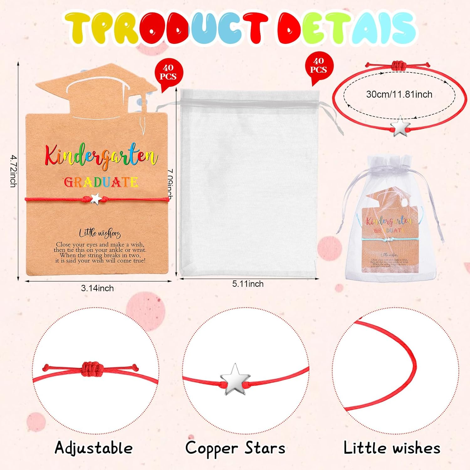 Features: Celebrate student's 2025 graduation with these lovely star bracelets . These are not just accessories, but also a cherished token of an unforgettable milestone achieved! The graduation bracelets come in 5 vibrant string colors, red, yellow, green, blue, and orange. Coupled with the brown kraft cards and white organza bags, this gift promises a merry and vibrant expression of congratulation. Specifications: Material: Star bracelets: copper and string Kraft cards: kraft Organza bags: organza Color: Star bracelets: red, yellow, green, blue, orange in string color Kraft cards: brown Organza bags: white Size: Star bracelets: approx. 0.24 inch/ 0.6 cm in star size Kraft cards: approx. 3.15 x 4.72 inches/ 8 x 12 cm Organza bags: approx. 5.12 x 7.09 inches/ 13 x 18 cm Package includes: 40 x Star bracelets 40 x Kraft cards 40 x Organza bags Notes: Manual measurement, please allow slight errors on size. The color may exist a slight difference due to different screen displays.