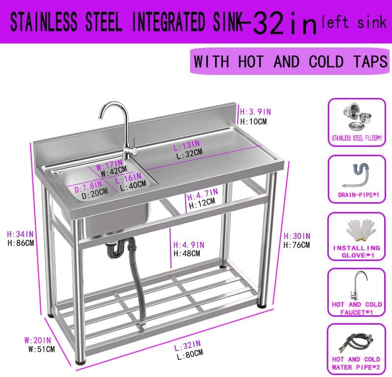[High quality stainless steel]: Our stainless steel sink is made of high quality stainless steel. Adjustable feet for stable mounting on uneven surfaces. This material is known for its strength and durability, ensuring that the product lasts for a long time and has good rust and scratch resistance. [Excellent drainage performance]: This practical sink is equipped with a filter basket to effectively prevent large foreign objects from entering and blocking the drain. S-shaped drain and drain plug prevent odor from escaping indoors [360° Rotary Faucet]: This faucet can be rotated 360° for easy access to hot and cold water, making your kitchen operation more flexible and efficient. Honeycomb outlets provide a soft, controlled flow for a better user experience. [Practical Storage and Work Space]: This stainless steel sink has a spacious countertop and lower shelf, providing plenty of storage space for kitchen utensils, towels and cleaning supplies, helping to keep it clean and organized and save space. [Easy to install and versatile]: This stainless steel sink is versatile and easy to install. Wear gloves when installing for added safety. It is ideal for a variety of uses such as dishwashing, food preparation, kitchen, bar, restaurant, garage and pet grooming. It is also suitable for outdoor use in the garden or backyard, bringing ultimate convenience to users.