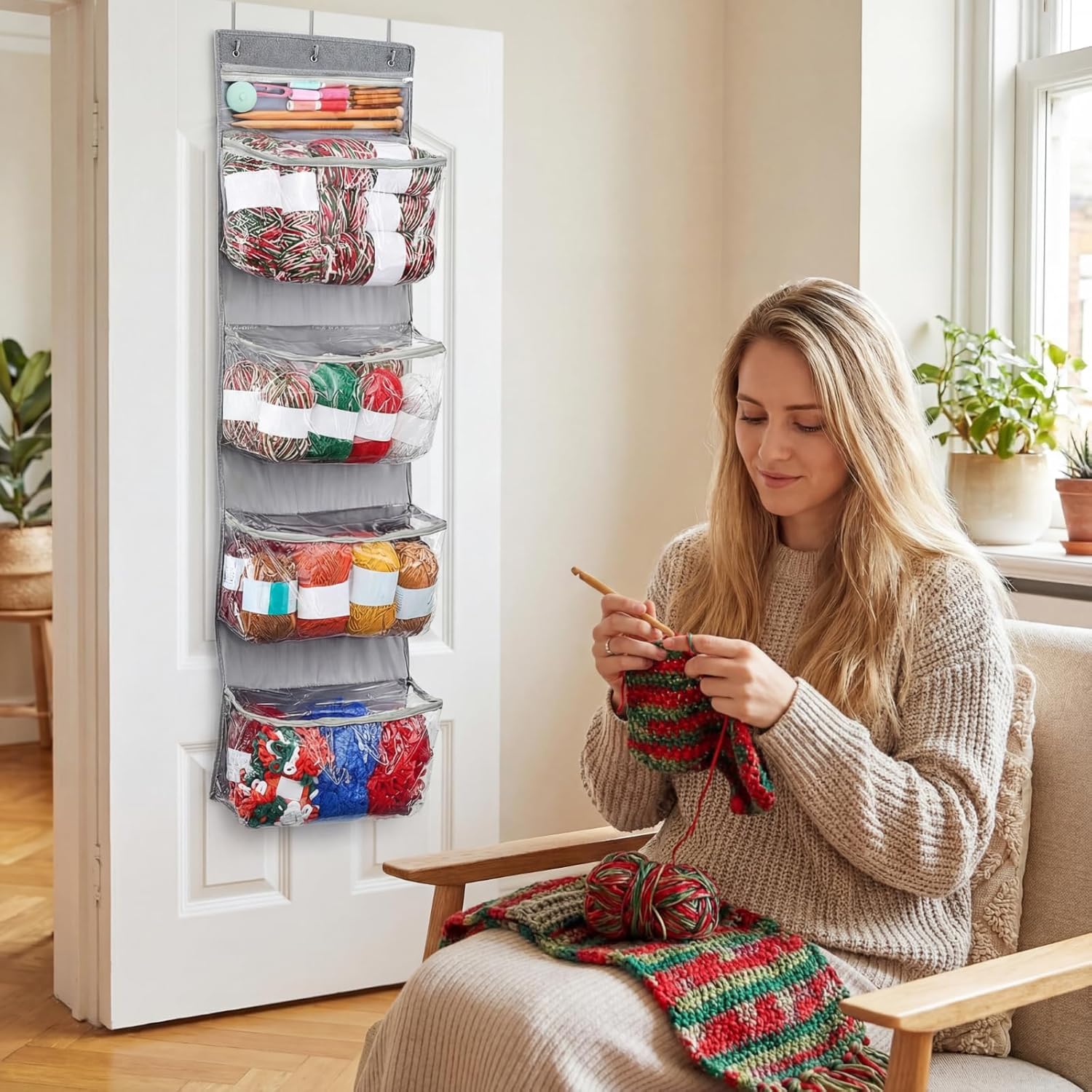 • Widely Use: this hanging yarn storage bag is suitable for storing large numbers of wool balls and assorted knitting accessories; However, its utility extends beyond that, it can be utilized as a backdoor organizer for storing diverse items like hats, towels, and pantry snacks; It efficiently clears clutter from your space and provides easy access with its secure zipper design