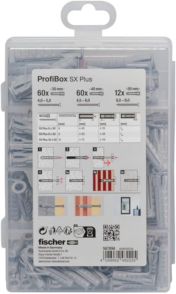 fischer professional box SX Plus dowels, dowel box with 132 expansion dowels: The fischer professional box is a practical dowel box, which is ideal for the workshop and construction site thanks to the high-quality and impact-resistant plastic. The five different sized compartments can store a wide range of dowels and screws. No more long searching: thanks to the transparent lid, you can see your dowel supply at first glance. Whether craftsmen, DIY enthusiasts or hobbyists: order in the workshop must be and the professional box offers the optimal solution for this. Even better than the box itself, the SX Plus expansion plug is the ideal nylon dowel for moving, moving, renovation and many repair work in everyday situations. Craftsmen, DIY enthusiasts and hobbyists are the perfect solution for anchoring in different types of building materials. The SX Plus dowels spread in four directions when screwing in and thus ensure optimal force introduction into the building material. At the same time, they offer high retention values in many solid and perforated building materials. The pronounced dowel edge prevents the dowel from slipping into the drill hole, so that easy pre-installation is possible. In addition, the special fixing wings of the SX Plus ensure a pre-fixing of the screw, which leaves both hands of the user free during the setting process. Can be used with wood, chipboard and standoff screws. Thus, spontaneous fastening tasks in building materials such as concrete, solid and perforated bricks, natural stone and much more. in no time at all and without much effort. The easy installation and very good holding values convince both professionals and DIY enthusiasts. Included in the professional box are: 60 x expansion dowels SX Plus 6 x 30. 60 x expansion dowels SX Plus 8 x 40. 12 x expansion dowels SX Plus 10 x 50. fischer – innovative solutions. fischer fastening systems is the largest division of the Fischer group of companies. The specialist for secure and economical fixings and connections in construction has become one of the market leaders over the past 70 years. The product range ranges from chemical systems to steel anchors to plastic dowels. Whether heavy duty fixings in tunnel, bridge or power plant construction for the professional or wall and cavity dowels for the DIY enthusiast: fischer offers the right solution for every mounting problem.
