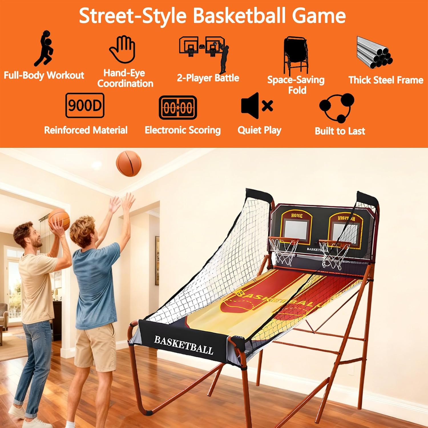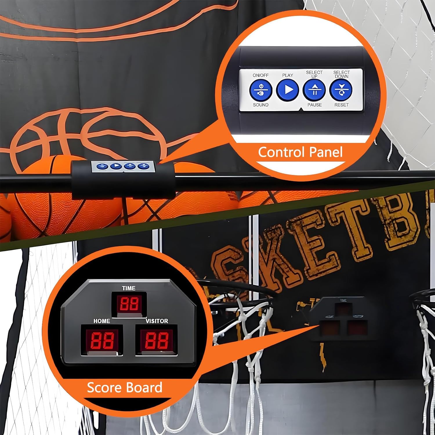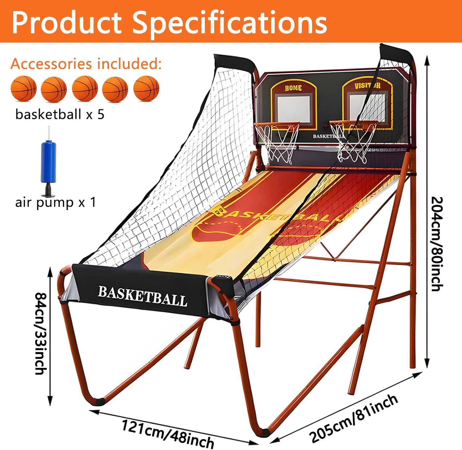 ⚾︎ Craving arcade basketball fun without leaving home? This dual-hoop game comes with 5 #3 balls, an electronic scorer, and an inflation pump for instant family and friend shootouts!⚾︎ Features- Thicker and sturdier backboard is very solid for long-term use.- 8 Different options for the interactive game, will provide endless fun!- DIY assembly is also fun, people can enjoy hours of interactive play- With its own electronic scoring system, you can play the game at home!- This product can also be used for various activities such as store promotion, advertising, etc.⚾︎ Specifications- Material: Iron pipe, thickened Oxford cloth, PE material- Hoop diameter: 457mm/18inch- Backboard size: 837×570mm/33 x 22inch- Product size (larger): 205×121×204cm/81×48×80inch- Product weight: 22.7KG/50lb- Packaging size: 130×60×13cm/51×24×5inch- Packaging weight: 24KG/53lb⚾︎ Package list- 1 x Two-person basketball shooting machine- 5 x #3 basketballs- 2 x Basketball hoops- 1 x Score display- 1 x Air pump- 1 x Clear English instruction manual⚾︎ Our ServicesWe provide reliable after-sales service, if you have any questions about the product, feel to contact us at any time.