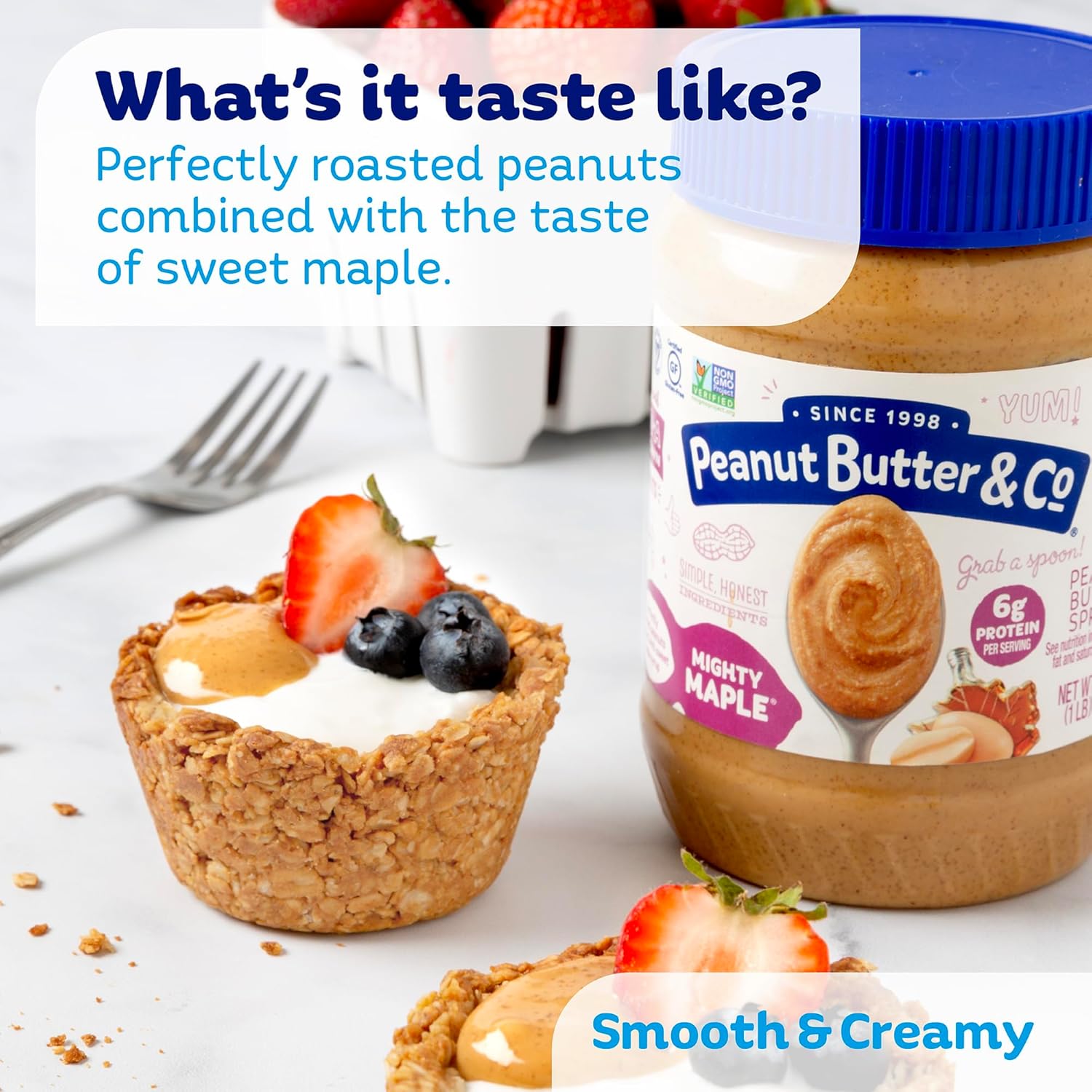 Mighty like a tall maple tree, our Mighty Maple is a sweet and nutty spread made from peanuts blended with real maple syrup, cane sugar, and a pinch of salt. We've added a little bit of palm oil to keep the peanut oil from separating so that there is no need to stir. Mighty Maple is great for melting and drizzling over pancakes, adding a dollop to ice cream, or grabbing a spoon and eating it straight from the jar!
