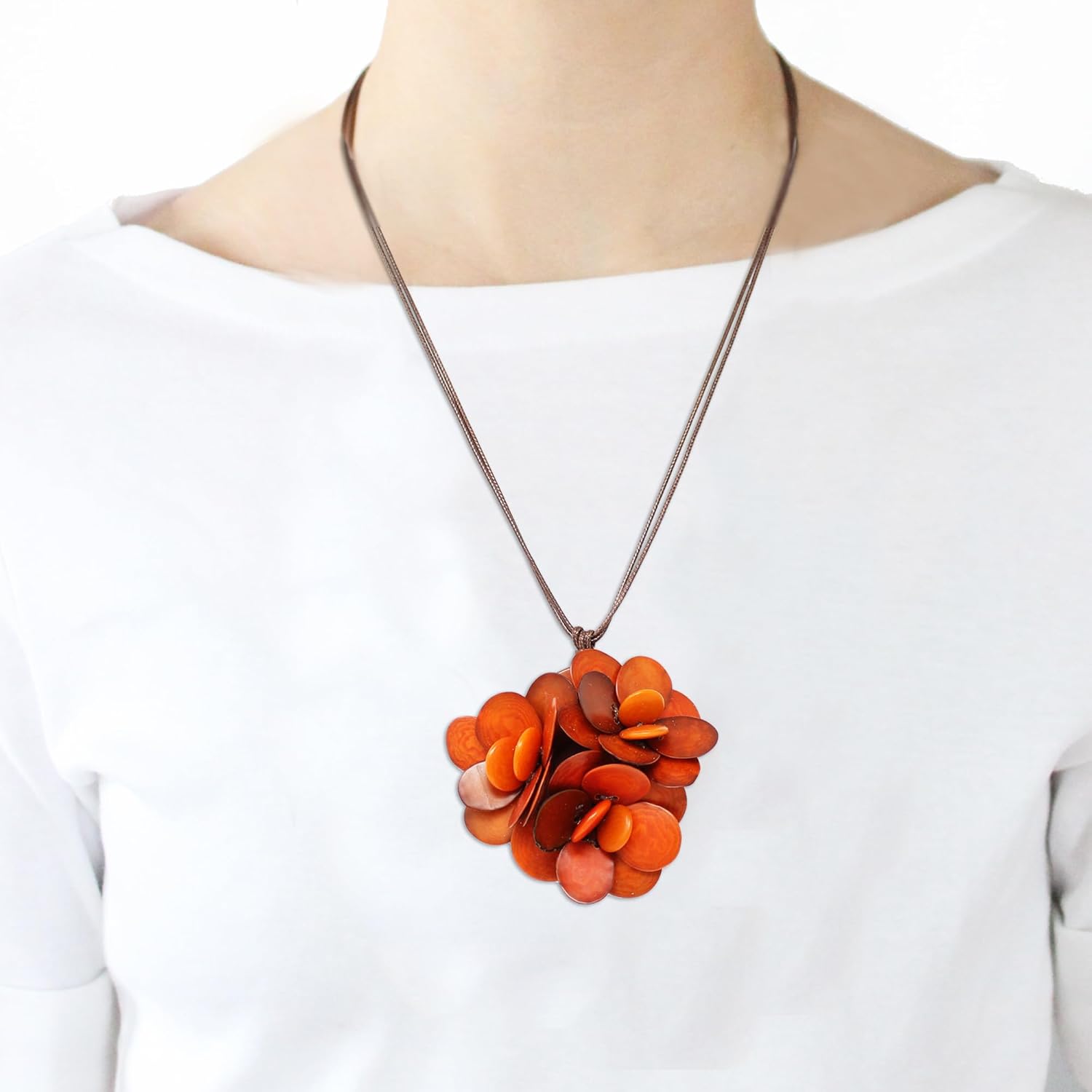 This gorgeous bouquet is a cluster of three flowers, comprised of tagua beads and their rind. When the tagua seeds are fully dried, the brown rind is shaved off and dyed, creating these naturally beautiful scales that are used to make up the flower’s petals. Two lentil-shaped tagua beads are placed in each flower’s center and all the parts are hand sewn together at the back with a cotton cord (The bouquet measures 1.5" x 1.5"). Two small tagua seeds finish it off at each end tip, and a macrame makes it adjustable for added versatility (measures 32”). All these natural beads are vegan, sustainable, and organic, pure eco-friendly vegetable ivory: plant-based accessories.When ripe, tagua seeds are harvested and sun-dried, becoming rock-solid to resemble ivory in color, texture, and hardness, hence their nickname: “Vegetable Ivory”